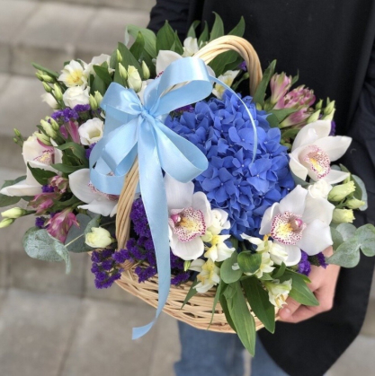Прекрасная корзина с орхидеями, гортензией и эустомой с добавлением альстромерий статицы и эвкалипта